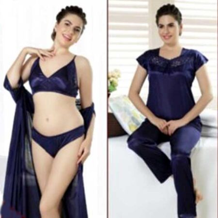 Flourish Bridal Nightwear navy blue 06 pieces beautiful princess sleepwear fairy night dress with bra and panty for women made with soft silk fabric.