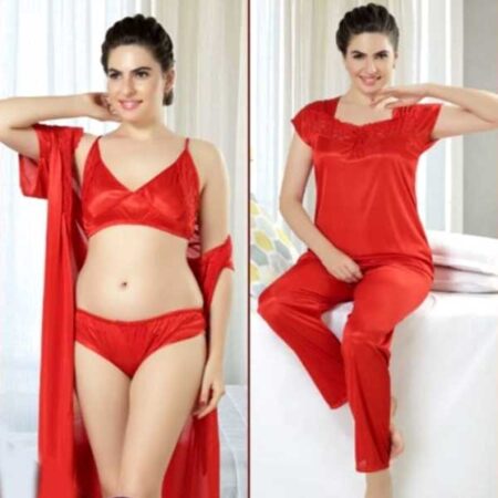 Flourish Bridal Nightwear red 06 pieces beautiful princess sleepwear fairy night dress with bra and panty for women made with soft silk fabric.