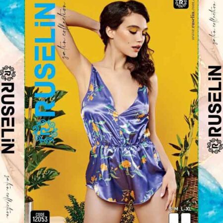 RUSELiN Lingerie flora printed sexy navy blue deep neck beautiful princess nightwear fairy bodysuit mini nightdress for women made with soft silk fabric.